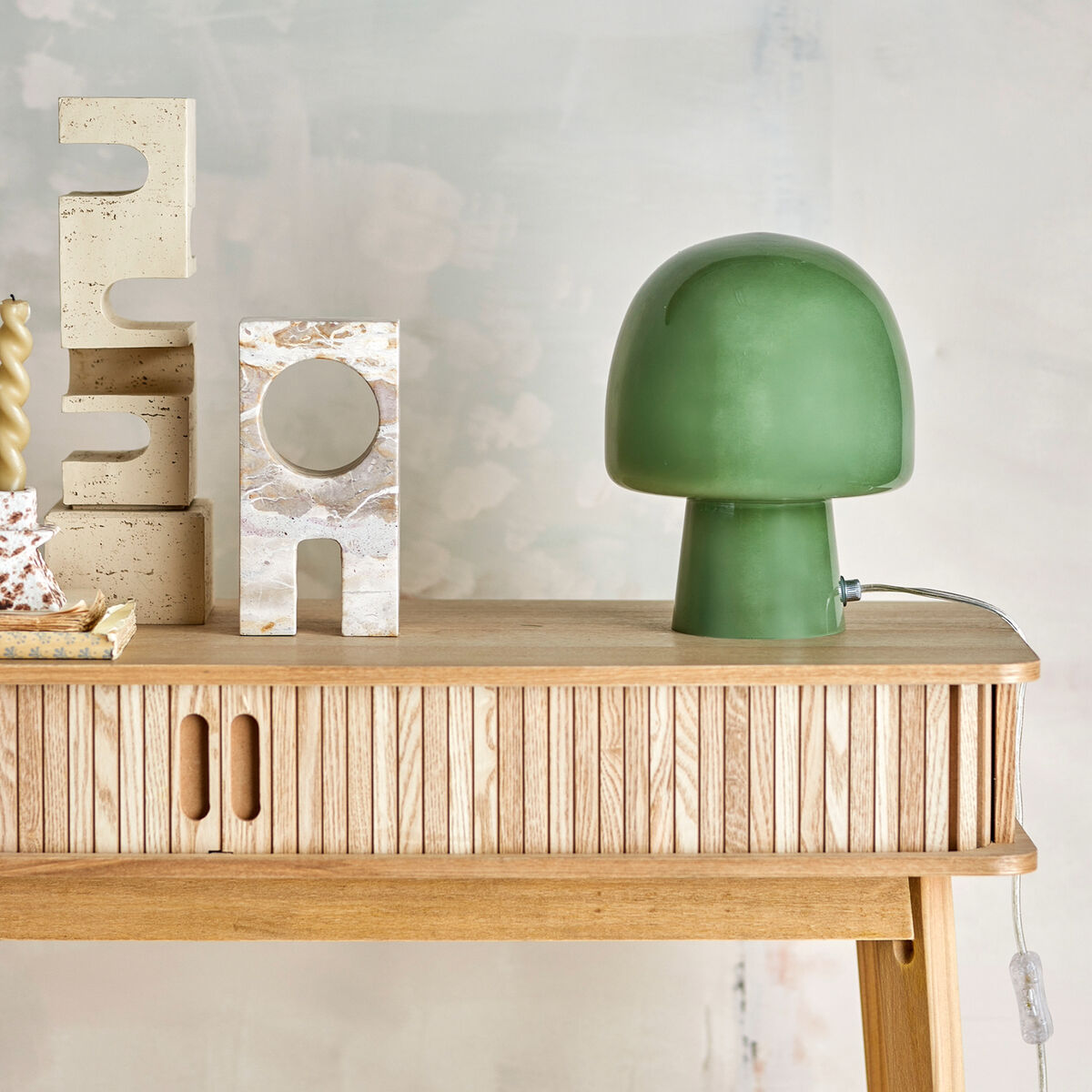 Paddy-pöytävalaisin on veikeän elegantti lisä sisustukseen. Sienenmuotoinen lasikupu tuo pehmeyttä ja persoonallisuutta tilaan – ja tekee vaikutuksen erityisesti silloin, kun valo syttyy. Sammutettuna valaisin on syvän vihreä, mutta valon loisteessa se muuttuu vaaleaksi vihreäksi ja paljastaa hennon elävän tekstuurin. Valaisin on valmistettu käsityönä, ja jokainen yksilö on hieman erilainen – juuri siksi niin kiinnostava. Paddy sopii täydellisesti yöpöydälle, ikkunalaudalle tai sivutasolle tunnelmaa luomaan.