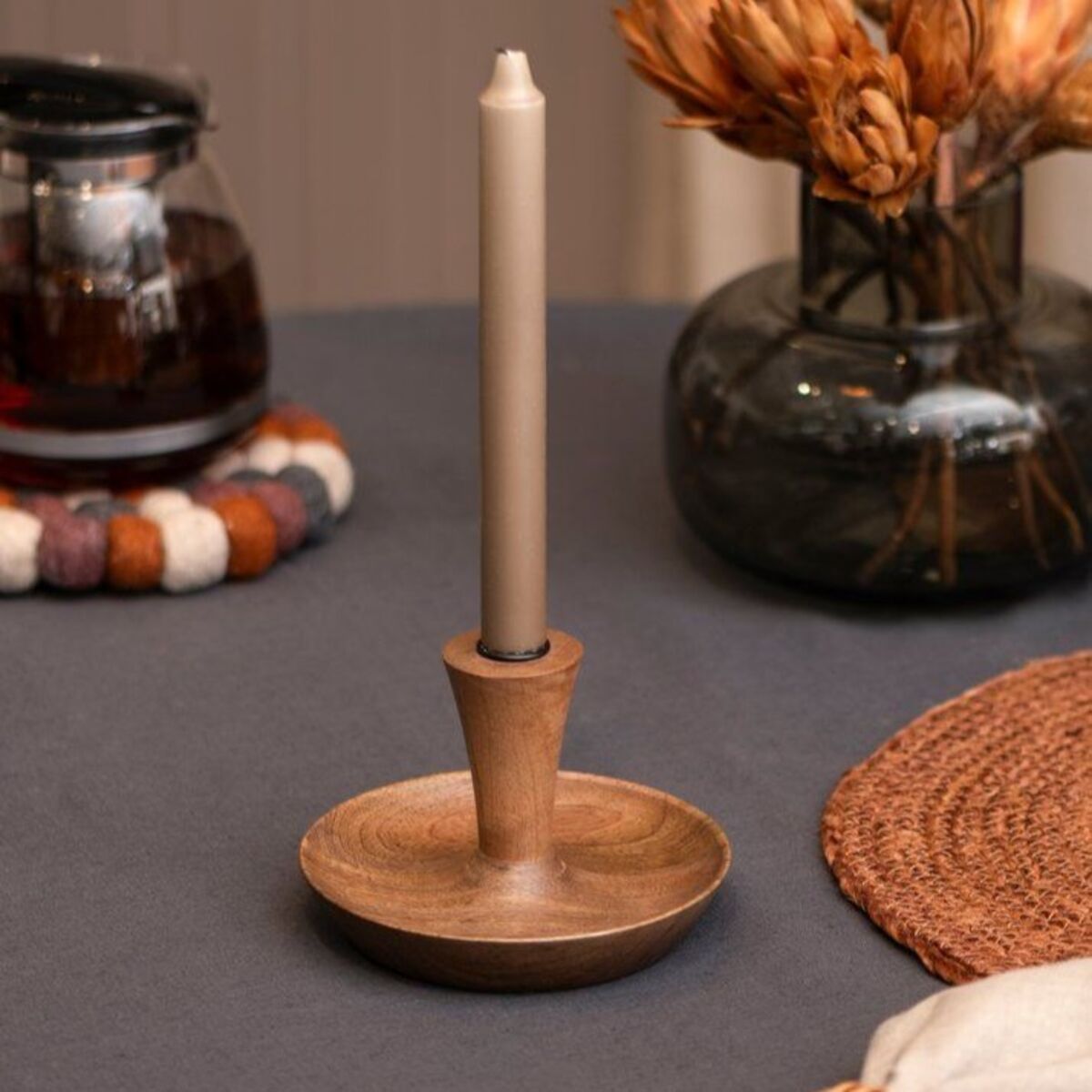 Luo kodikasta tunnelmaa ja lämmintä valoa kotiisi kauniilla mangopuusta valmistetulla kynttilänjalalla. Aseta kynttilänjalka ruokapöydälle, olohuoneeseen tai vaikka kylpyhuoneeseen luomaan rentouttavaa ja kutsuvaa tunnelmaa. Kynttilänjalka on suunniteltu yhdelle kruunukynttilälle.