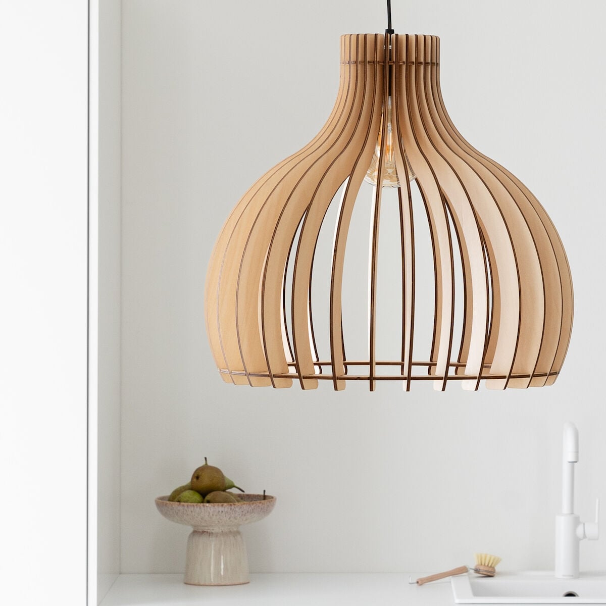 Kaarre riippuvalaisin on todella kaunis ja ajaton valaisin, joka on helppo yhdistää monenlaiseen sisustukseen. Se sopii kaikkiin kodin kuiviin tiloihin. Valaisimen varjostimesta tulee kaunis varjo puisen säleikön välistä. Puu materiaalina tuo lämpöä ja pehmeyttä sisustukseen. Lamppu näkyy säleikön välistä, joten lampun valinnalla ja valon sävyllä voit vaikuttaa valaisimen ulkonäköön. Johdon pituus 2 m, korkeus säädettävissä. Johdon väri luonnonvärisessä valaisimessa miljöökuvista poiketen on valkoinen. Valaisimessa on tavanomainen skandinaavinen kattokuppi, eli se sopii mainiosti kattokoukkukiinnitykseen valaisinpistotulpan kanssa. Pakkaukseen ei sisälly valaisinpistotulppaa, joten osta lisäksi sopiva johdollinen valaisinpistotulppa, mikäli asennat valaisimen valaisinpistorasiaan, jossa on paikka valaisinpistotulpalle. ...