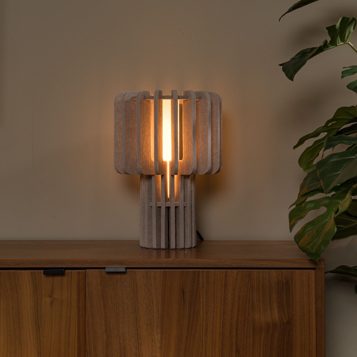 Rollo pöytävalaisin hurmaa ainutlaatuisella ilmeellään ja tuo sisustukseen lämpöä sekä modernia tyyliä. Kierrätysmateriaaleista valmistettu huoparakenteinen varjostin huokuu luonnonläheisyyttä ja luo pehmeän, tunnelmallisen valaistuksen. Lasivarjostimen mitat ovat 4,5 cm x 4,5 cm x 22 cm, joten valaisimeen sopiva lamppu kannattaa valita huolella (suositeltava lampun koko esim. Ø3 cm x 20 cm). Rollo ei ole pelkästään tyylikäs, vaan myös käytännöllinen. Huopa toimii akustiikkaa parantavana materiaalina, tehden tilasta miellyttävämmän sekä visuaalisesti että äänimaailmaltaan. Tämä valaisin sopii täydellisesti yöpöydälle, työpisteelle tai olohuoneen lukunurkkaukseen – missä tahansa kaipaatkin kodikasta tunnelmaa ja persoonallista designia.