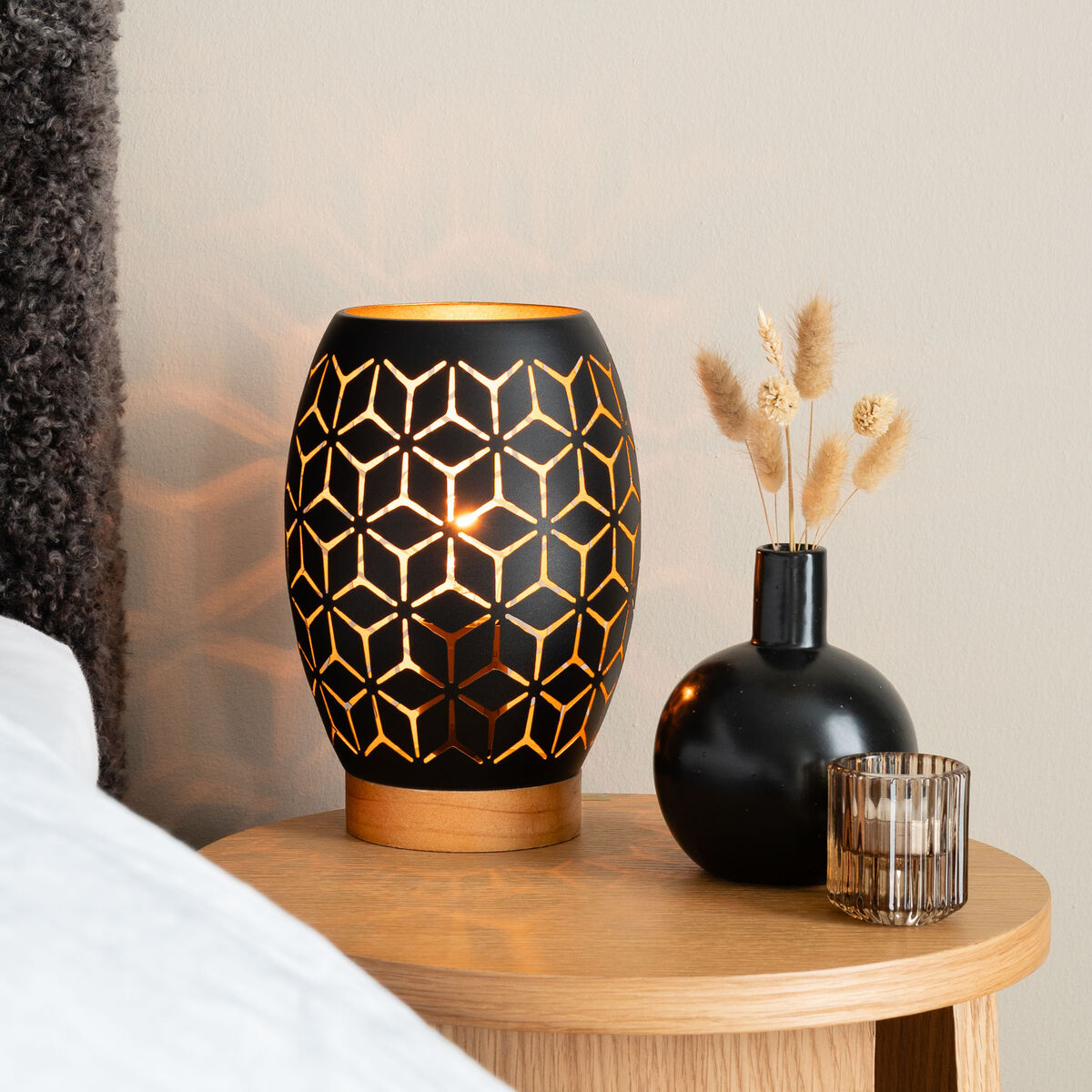 Trio Bidar pöytävalaisin on tunnelmallinen koristevalaisin, jossa yhdistyvät tyylikkäästi maanläheistä lämpöä luova puu ja metalli. Varjostimen reiät siivilöivät valoa kauniissa, kukkamaisessa muodossa ja valaisin toimii upeana sisustuselementtinä valon ollessa sammutettunakin. Valaisimen johdossa on virtakytkin. Pakkaus ei sisällä lamppua.